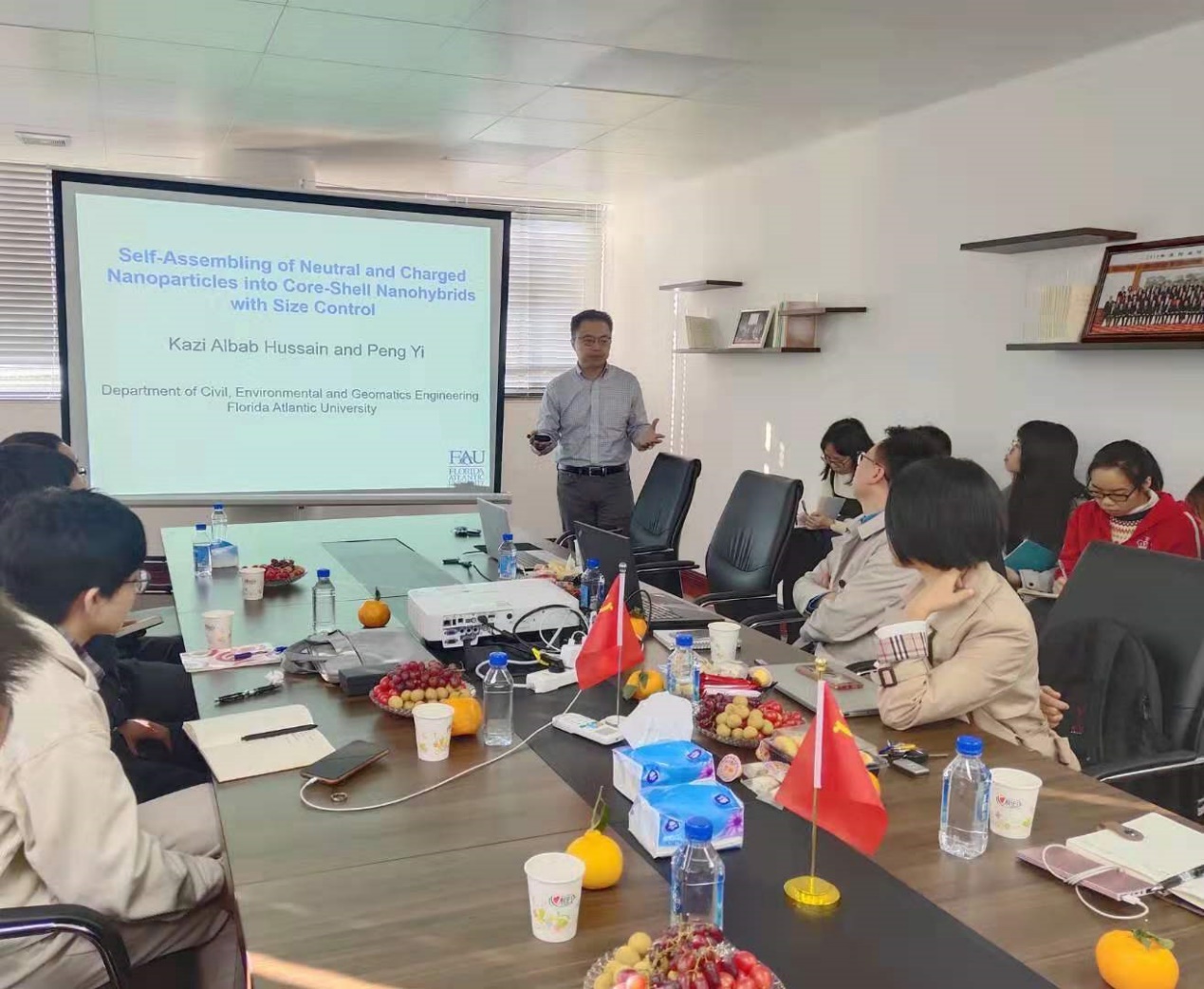 沙龙伊始,易鹏老师就“Self-Assembling of Neutral and Charged Nanoparticles into Core-Shell Nanohybrids with Size Control”进行报告。易鹏老师从纳米核壳材料制作的老方法所存在的问题引入自己的核壳结构制备新方法,详细介绍了以氧化铁和聚苯乙烯为原材料的新型核壳结构制备过程,探明了各种影响因素对核壳结构形成的影响规律,最后,易鹏老师总结出控制纳米核壳结构形成尺寸的方法。该方法相较于传统合成方法具有能耗小、成本低等优势,为纳米核壳结构材料的制备提供了一种新思路。