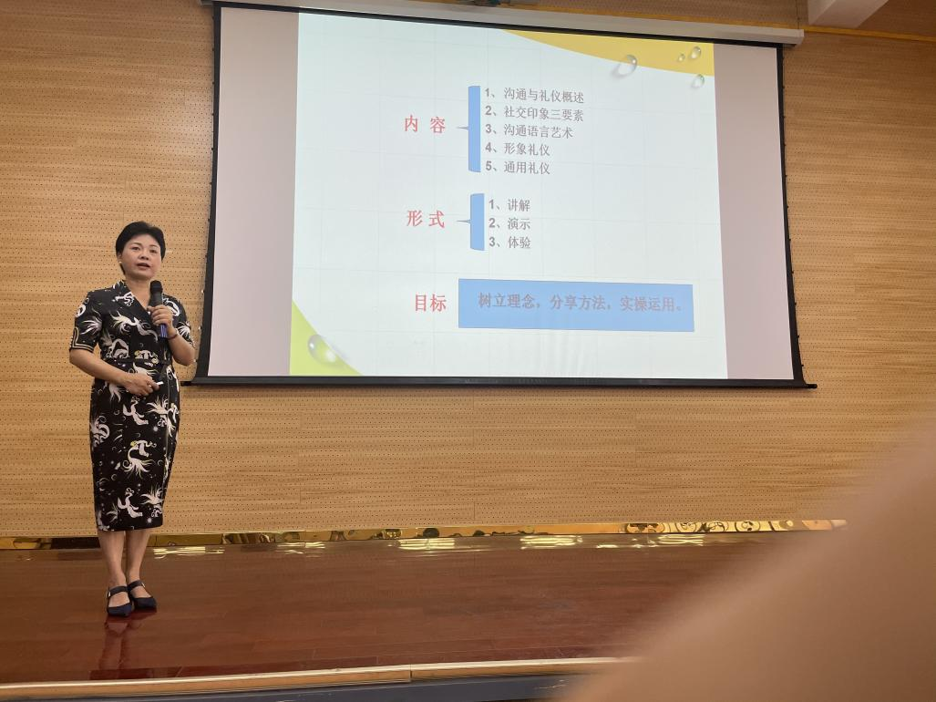 在科技南楼一楼报告厅举行大学生社交礼仪专题培训,邀请了学校通识教育中心张少慧副教授为同学们授课。学院党委副书记武慧娟、辅导员章莹、2022级全体新生和2021级本科生参加了本次培训。