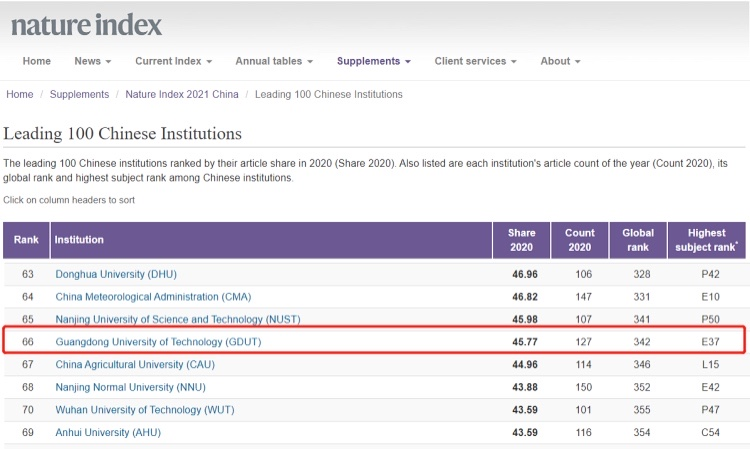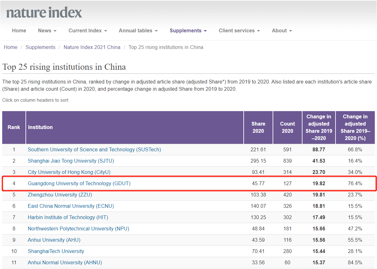 榜单显示,我校2020年在自然指数分析所采用的82种高质量自然科学期刊上发表的文章数为127篇,贡献份额为45.77,自然指数综合科研实力位列中国科研机构第66位,高校排名第58位,全球综合排名第342位。另外,我校2020年文章贡献份额较2019年增长了19.82,增长比为76.4%,位居中国25强新兴科研机构名单第4位。