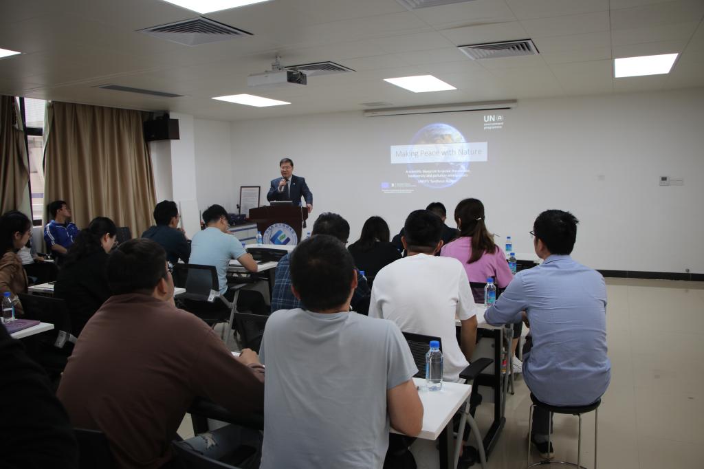 315日上午,联合国环境规划署首席科学家刘健博士受邀访问研究院,并在科技北楼401会议室作学术报告。会议由研究院常务副院长蔡宴朋教授主持,研究院冯景春教授、解玉磊教授、陈姗姗教授等40余名教师、博士后和研究生现场聆听了报告。