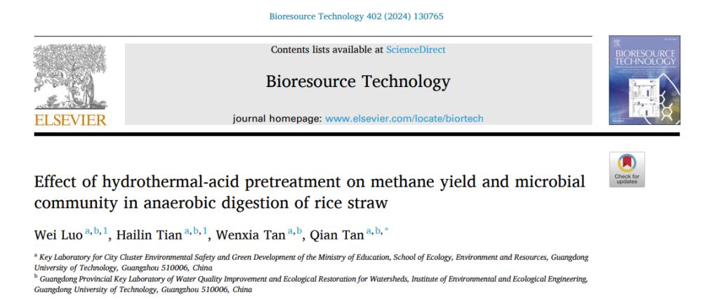 谭倩教授课题组研究成果“Effect of hydrothermal-acid pretreatment on methane yield and microbial community in anaerobic digestion of rice straw”在中科院1区TOP期刊Bioresource Technology上发表。谭倩教授为论文通讯作者,硕士研究生罗威与田海林教授为论文共同第一作者。