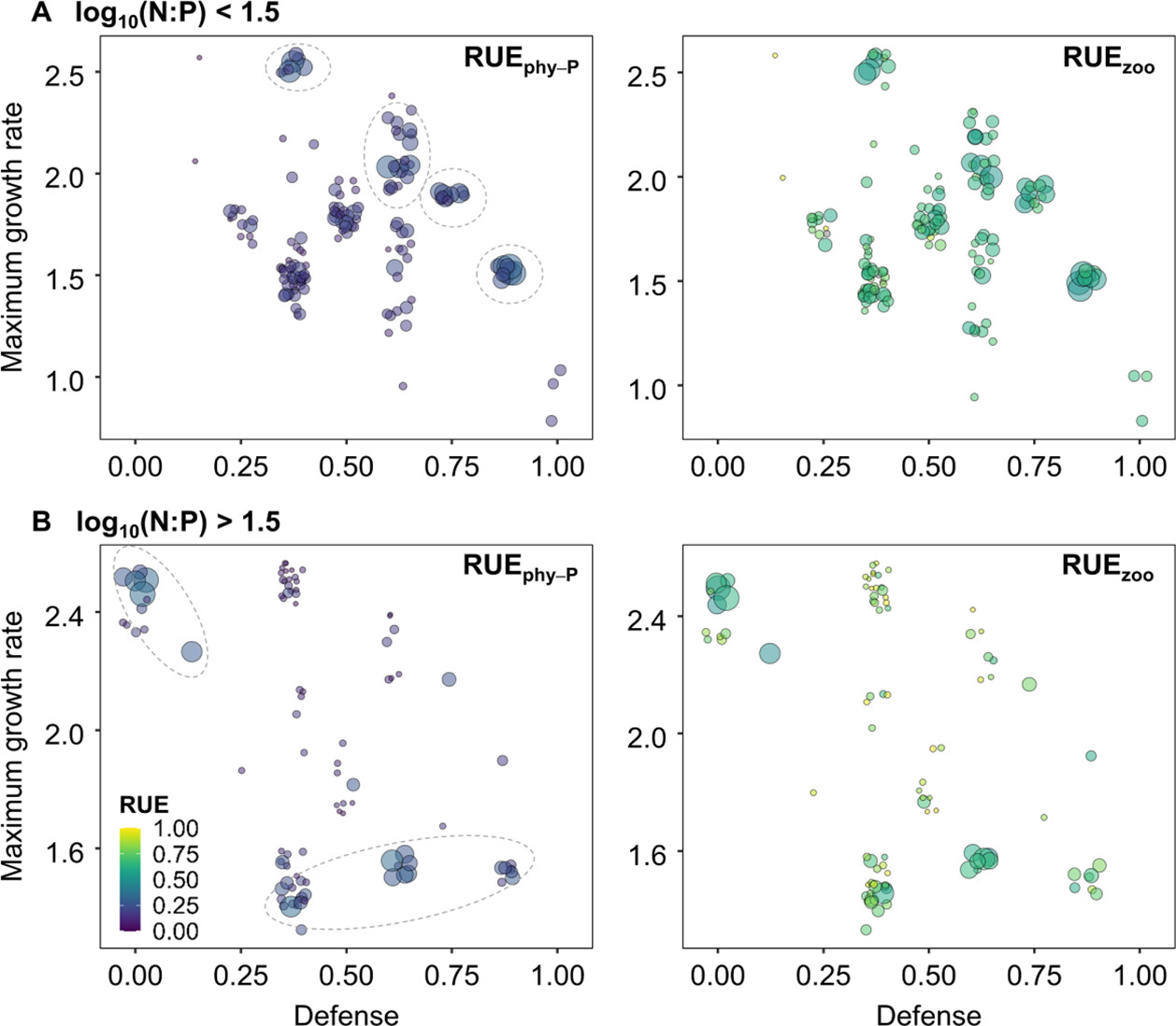 图3:珠江口浮游植物群落在不同N:P条件下的物种相对生物量。Log10(N:P)<1.5时,珠江口浮游植物群落倾向于凸形生长-防御权衡模式,Log10(N:P)>1.5时倾向于凹形权衡。圆的大小代表每个样点中物种的相对生物量。左侧颜色表示浮游植物对磷的资源利用效率,右侧面板的颜色表示浮游动物的资源利用效率。