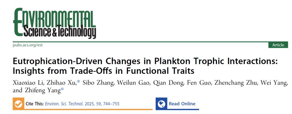 杨志峰院士团队徐志豪教授等在领域知名期刊Environmental Science & Technology发表题为“Eutrophication-Driven Changes in Plankton Trophic Interactions: Insights from Trade-Offs in Functional Traits”的研究论文,李晓晓博士后为第一作者,杨志峰院士和徐志豪教授为通讯作者,北京师范大学为论文合作单位。