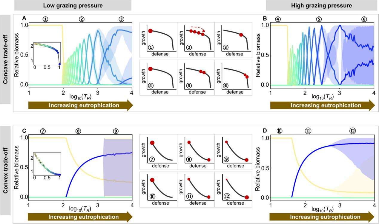 图2:防御权衡的营养盐-浮游植物-浮游动物系统动力学模型模拟富营养化梯度下浮游植物不同物种生物量动态变化。上图为凸型生长-防御权衡曲线,下图为凹形。左侧为低捕食压力,右侧为高捕食压力。中部嵌套图展示了不同营养盐梯度上浮游植物群落主导物种的功能策略选择。图中实线展示存续物种的生物量,阴影区域表示物种生物量的最大值和最小值,阴影区域越大,则物种生物量振荡幅度越高。
