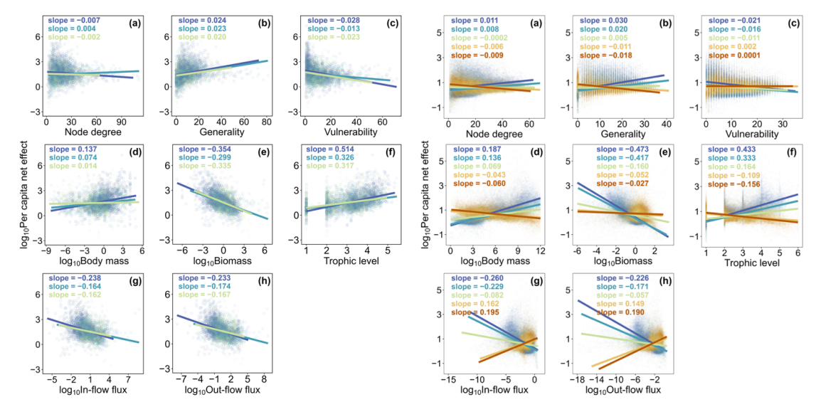 在底部重的金字塔型食物网结构中(即物种体重与其生物量之间呈负相关),体型较大、营养级较高的物种往往是关键种;反之,在呈倒金字塔结构的顶部重食物网中(体重与生物量呈正相关),这种趋势发生了逆转,物种的能量特征与关键性的关系显著减弱甚至反向。