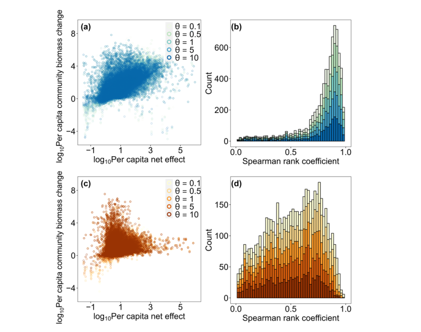 此外,经典的“逆群落矩阵(inverse community matrix)”方法常用于推导胁迫扰动下物种的净效应,以表征其关键种程度,但该方法对系统稳态作线性近似,忽略了生态系统在强干扰下可能产生的非线性响应(如加速或饱和效应)。