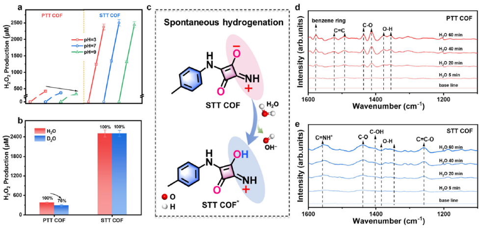 图3. (a)STT COF和PTT COF在不同pH下的光催化产H2O2活性。(b)STT COF和PTT COF在H2O和D2O中光催化产H2O2的活性比较。(c)STT COF自发氢化过程示意图。(d)PTT COF及(e)STT COF在暗条件下连续通入水蒸气时的原位DRIFT谱。