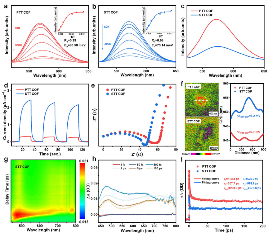 图4. (a) STT COF及(b) PTT COF的温度依赖光致发光(TD-PL)光谱(插图:PL强度与温度关系,使用Arrhenius方程拟合)。(c) PTT COF和STT COF的光致发光(PL)发射光谱。(d)可见光照射下的瞬态光电流。(e)可见光照射下的电化学阻抗谱(EIS)。(f) PTT COF和STT COF的KPFM表面电位图(左)及两种COF的接触电势差(CPD)测量结果(右)。(g) STT COF的二维伪彩色瞬态吸收(TA)光谱图。(h) STT COF的TA光谱信号。(i) PTT COF和STT COF在485 nm波长下的TA动力学及典型拟合曲线。