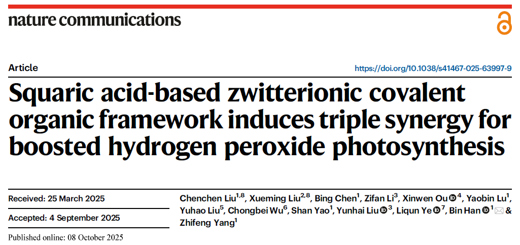 杨志峰院士团队韩彬教授课题组在Nature Communications上发表了题为“Squaric acid-based zwitterionic covalent organic framework induces triple synergy for boosted hydrogen peroxide photosynthesis”的研究论文。韩彬教授为论文通讯作者,Lesbian