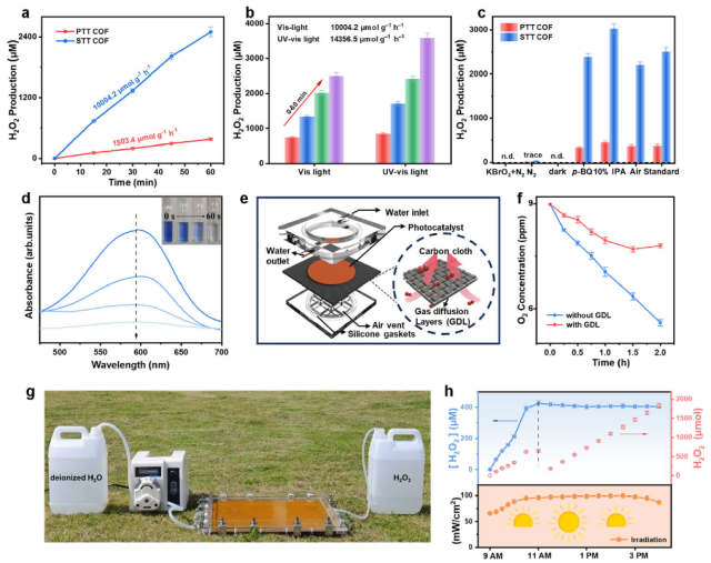 图2. (a) PTT COF和STT COF在纯水中光催化生成H2O2的活性(不使用牺牲剂),条件:水20 mL,催化剂5 mg,可见光照射,420 nm < λ < 780 nm。(b)STT COF在300 W氙灯不同波数条件(可见光420–780 nm;UV-vis光320–780 nm)下的光催化H2O2浓度和产量。(c)不同条件下COF光催化产H2O2的活性比较(标准条件、空气、黑暗、N2、N2+KBrO3(10 mM)、10% IPA以及p-BQ (0.01 mM)。(d)利用STT COF生成的H2O2进行Fenton反应降解亚甲基蓝。(e)连续流膜反应器示意图。(f)气体扩散层在UV-vis光照条件下的作用实验。(g)连续流膜反应器在自然光照条件下的实物照片。(h)连续流膜反应器在自然光照条件下的H2O2合成性能。