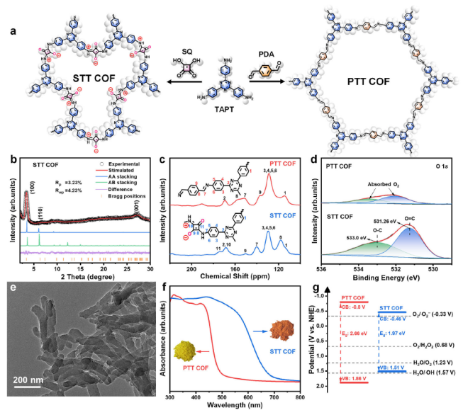 图1.(a) PTT COF和STT COF的合成过程示意图。(b) STT COF的PXRD数据及模拟图谱。(c) PTT COF和STT COF的13C固体核磁共振(ssNMR)谱图。(d) PTT COF和STT COF的O 1s XPS能谱。(e) STT COF的透射电子显微镜(TEM)图像。(f) PTT COF和STT COF的紫外-可见漫反射吸收光谱。(g) PTT COF和STT COF的能带结构示意图。