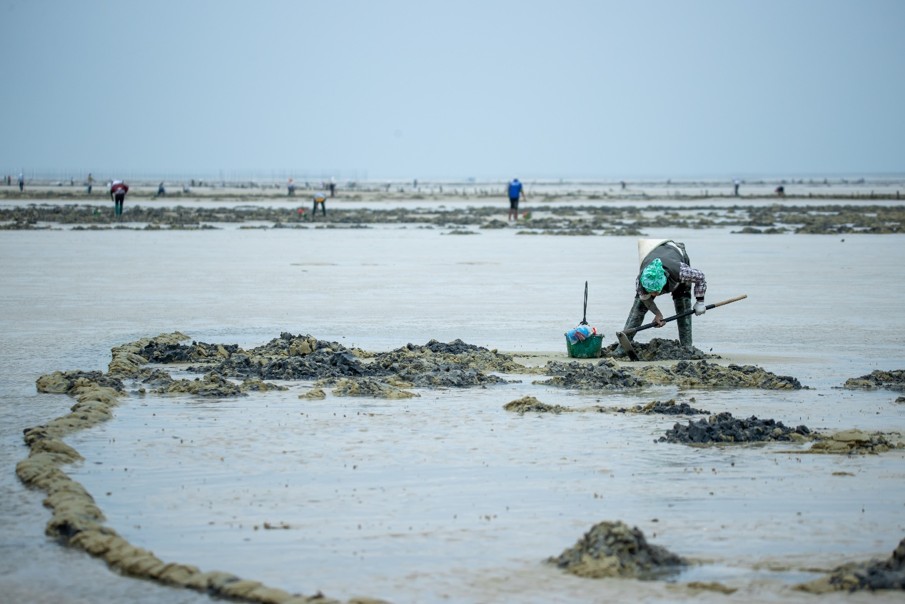 平坦的滩涂底下养殖着大量的贝类(照片拍摄:凃汉明)