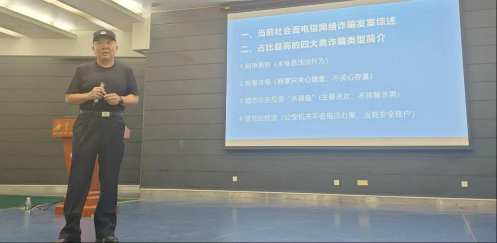 吴志刚警官以番禺区受诈骗数据为切入点,结合近年来网络诈骗的典型案件,针对购物平台刷单、网络贷款、冒充客服骗退货、婚恋贷款“杀猪盘”、冒充公检法和不健康网址及相关链接等常见的网络诈骗案例和手段,向新生详细讲解了诈骗团伙的作案手法和套路,用生动的案例指导同学们如何防范诈骗和及时止损。