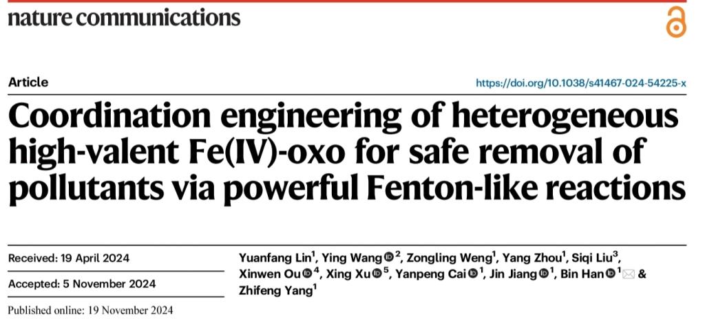 杨志峰院士团队韩彬教授课题组在Nature Communications上发表了“Coordination engineering of heterogeneous high-valent Fe(IV)-oxo for safe removal of pollutants via powerful Fenton-like reactions”的研究论文。韩彬教授为论文通讯作者,Lesbian