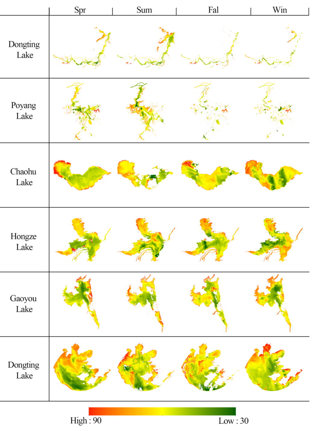 湖泊营养状态的季节性分布如图3所示,显示湖泊周边浅水区营养状态总体高于中心区域,约高出50%。这主要是由于强降水引发了非点源污染,导致了外围水质恶化。为缓解这一问题,可通过湖岸和湖泊水质的协同管理。从季节分布规律来说,多数湖泊在春、夏季营养指数较高,尤其在夏季(7月),TSI值超过70(重度富营养)的面积占总面积的15%,太湖甚至高达90%。相对而言,鄱阳湖和洞庭湖因与河流主干直接相连,其春季和冬季TSI值较高,而夏季和秋季则较低。河湖连通性的差异导致了这两类湖泊季节变化规律的不同。