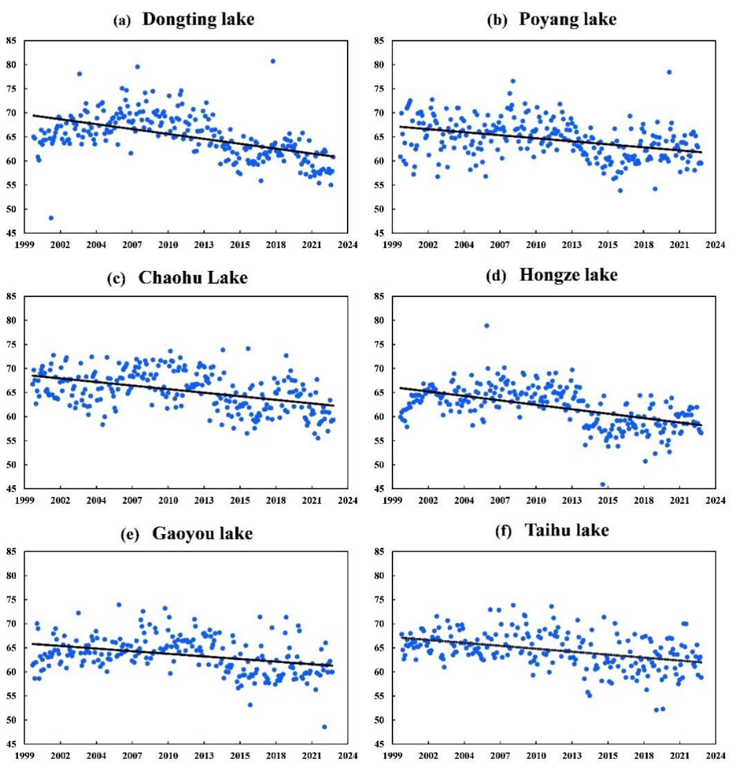 图2 案例湖泊营养状态指数(TSI)多年变化及趋势。(a)洞庭湖;(b)鄱阳湖;(c)巢湖;(d)洪泽湖;(e)高邮湖;(f)太湖。