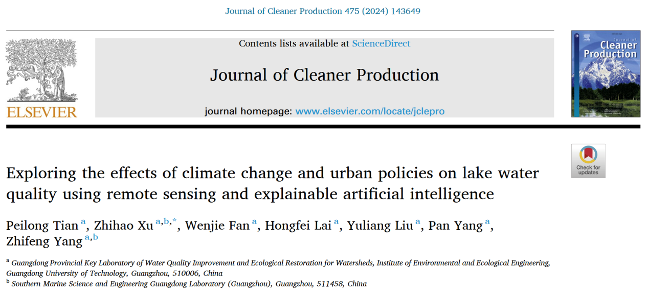杨志峰院士团队徐志豪教授等在SCI一区TOP期刊Journal of Cleaner Production发表成果“Exploring the effects of climate change and urban policies on lake water quality using remote sensing and explainable artificial intelligence”,第一作者为Lesbian