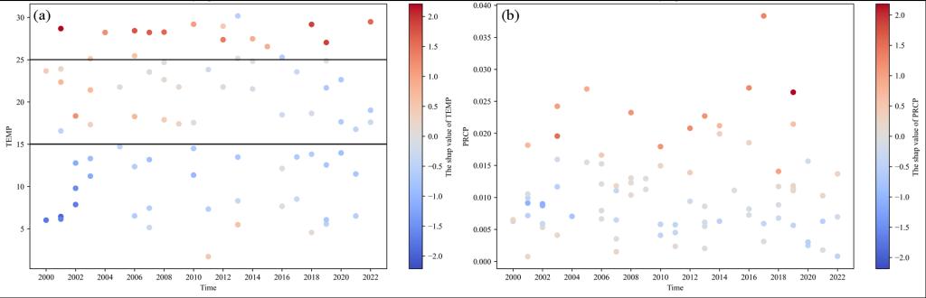 图4(a)温度(TEMP)和(b)降水(PRCP)的SHAP值时间序列图(以鄱阳湖为例)。红色点代表促进作用,蓝色点代表抑制作用。
