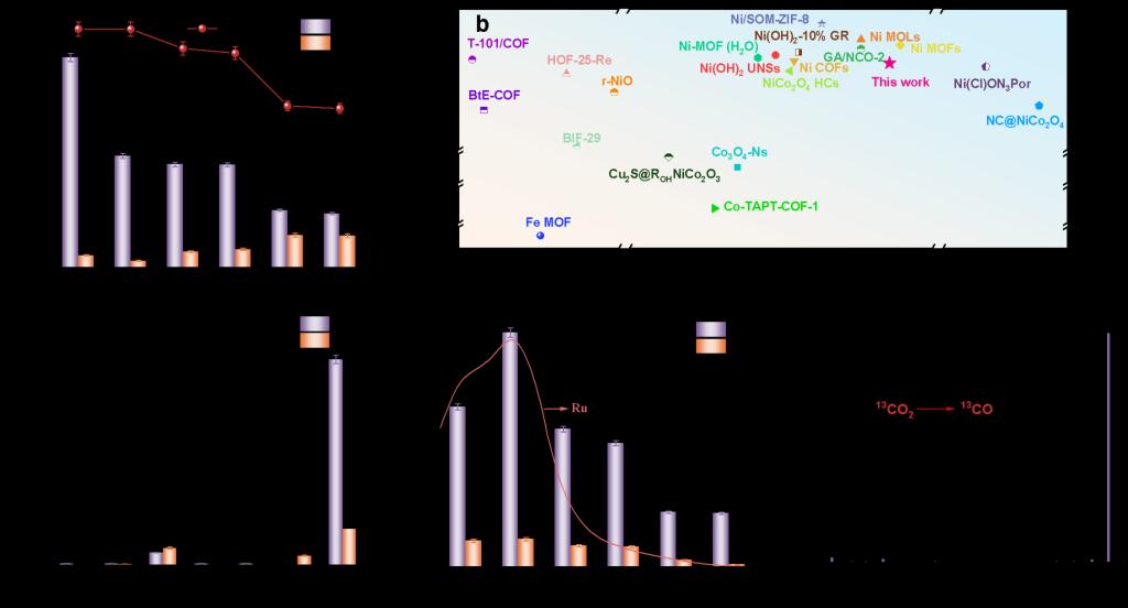 图3.(a)在纯CO2、10%CO2以及模拟烟气(10% CO2混合2% NOx和SOx浓度)条件下,不同催化剂CO2还原为CO的催化性能。(b)在纯CO2条件下,Ni-O4CMOFs与其他有机或无机催化剂在CO生成速率和选择性方面的性能比较。(c)在Ni-O4CMOFs体系中,在不同条件下进行的对照实验。(d)在波长为420、450、485、520、535和595 nm的单色光照射下,Ni-O4CMOFs生成CO和H2的情况。(e)在13CO2气氛中,使用Ni-O4CMOFs作为催化剂进行光催化CO2还原为CO产物的同位素分析。