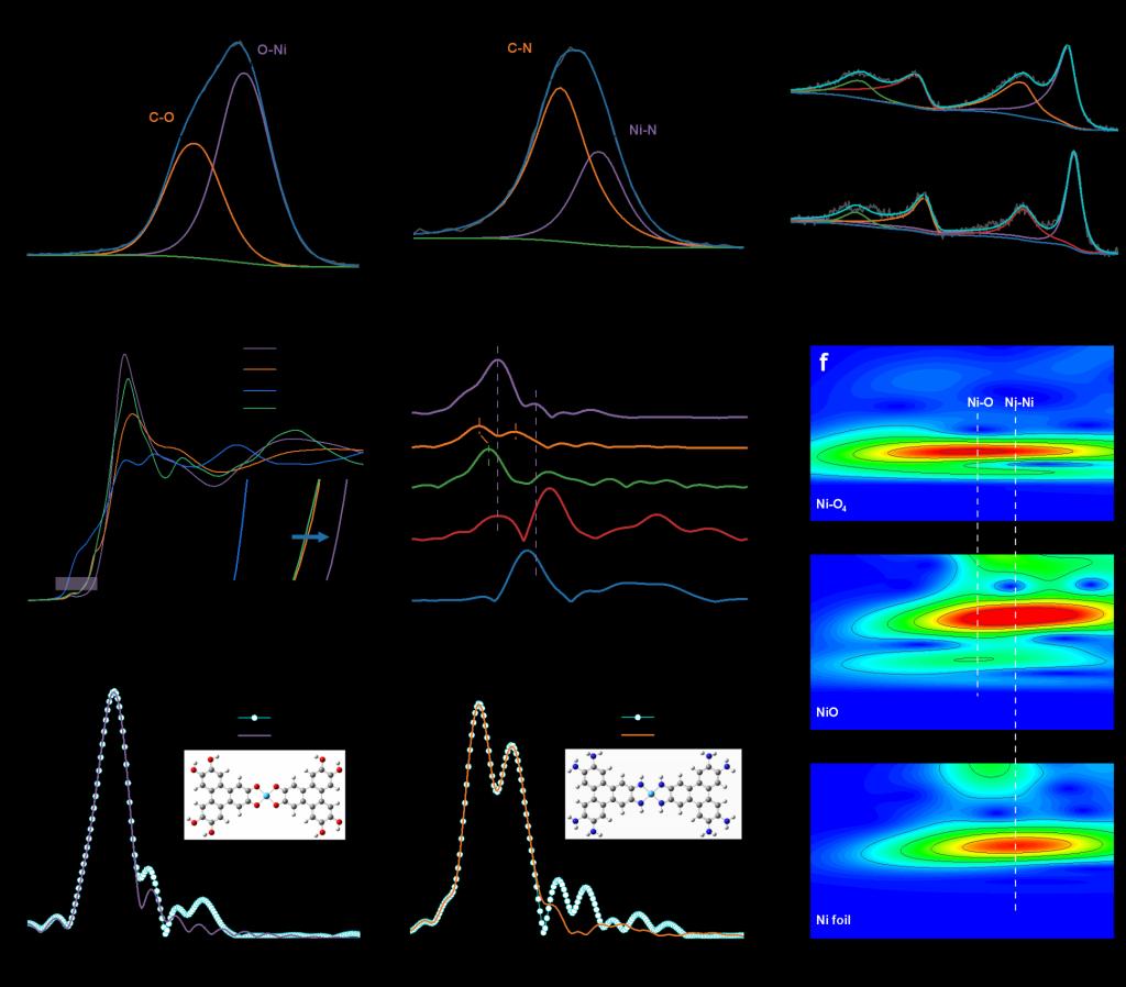 图2. XPS光谱:(a)Ni-O4CMOFs的O 1s精细谱;(b)Ni-N4CMOFs的N 1s精细谱;(c)Ni-O4CMOFs和Ni-N4CMOFs的Ni 2p精细谱;(d)Ni-O4CMOFs、Ni-N4CMOFs、镍箔和NiO的Ni K边XANES光谱,(d)的插图为相应XANES光谱的部分放大图;(e)Ni-O4CMOFs、Ni-N4CMOFs、镍箔、NiPc和NiO的EXAFS光谱;(f)Ni-O4CMOFs、NiO和镍箔的EXAFS光谱的小波变换;(g, h)Ni-O4CMOFs和Ni-N4CMOFs的实验和拟合EXAFS曲线。