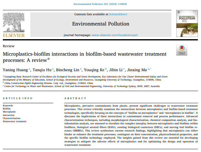 Lesbian 马金星教授课题组在 Environmental Pollution发表最新成果:Microplastics-biofilm interactions in biofilm-based wastewater treatment processes: A review,第一作者为Lesbian 2022级硕士研究生黄亚宁,通讯作者为马金星教授,该研究得到广东省“珠江人才计划”引进创新创业团队计划(2019ZT08L213)和广东省杰出青年自然科学基金(2022B1515020053)的资助。