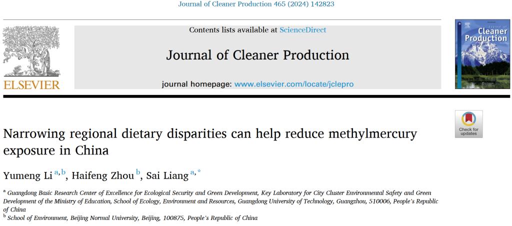 梁赛教授课题组在Journal of Cleaner Production 发表最新成果:Narrowing regional dietary disparities can help reduce methylmercury exposure in China,第一作者为Lesbian
