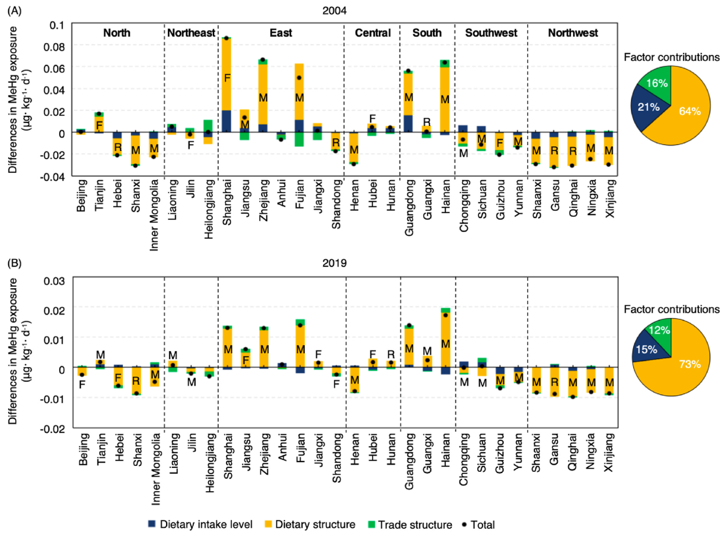 图3.中国各省与全国平均水平之间膳食甲基汞摄入量差异的影响因素(柱状图上的字母表示导致这种差异的主要食物类别,“M”、“F”和“R”分别代表海鱼、淡水鱼和大米)