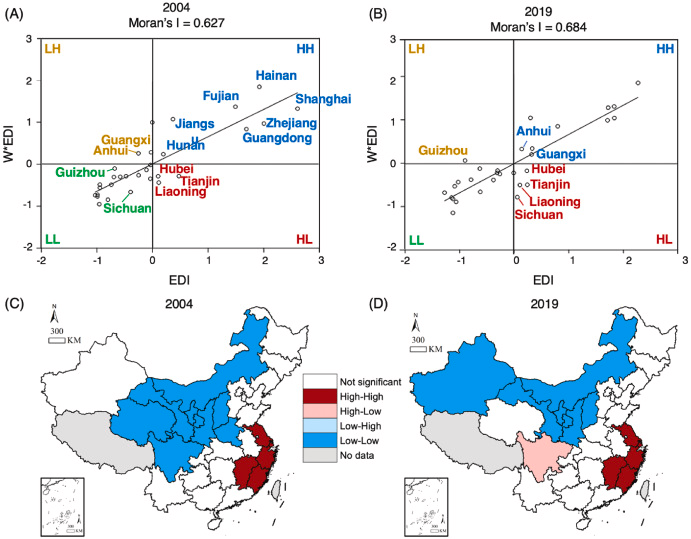 图2.中国各省膳食甲基汞暴露的空间相关性(图A和B分别为2004和2019年中国人群膳食甲基汞暴露的Moran散点图;图C和D为LISA(Local Indicators of Spatial