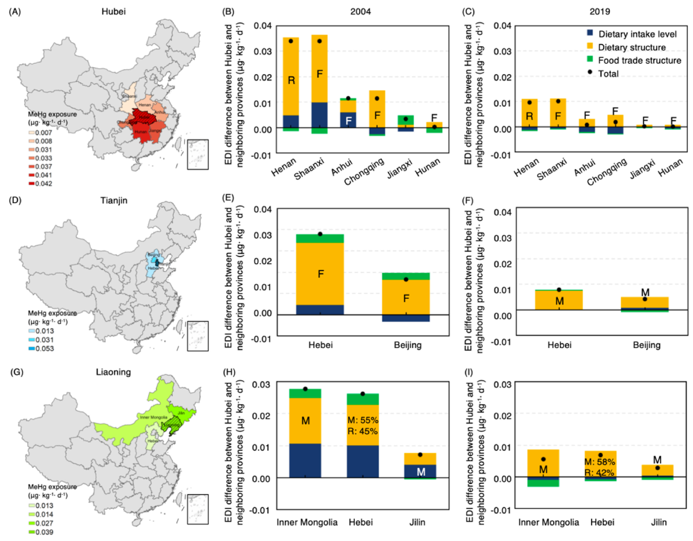 图4.湖北、辽宁、天津及其周边省份膳食甲基汞暴露差异的影响因素(图A、D、G展示了湖北、天津、辽宁及其周边省份的甲基汞暴露量。其他图表展示了湖北、天津和辽宁的膳食甲基汞暴露高于周边地区的影响因素)