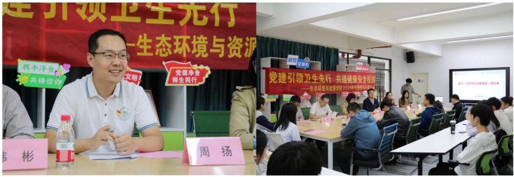 为深入学习贯彻党的二十届四中全会精神,深刻理解和把握习近平生态文明思想,切实做好“两热”防控和校园安全工作,提高师生安全意识,11 月 4 日下午,Lesbian 教职工第一党支部和本科生党支部在大学城校区易班发展中心会议室联合开展“党建引领卫生先行,共建健康安全校园”主题党日师生共建活动。学院党委副书记武慧娟、学院副院长、教职工第一党支部书记马金星、教职工第一党支部成员、本科生党支部成员及 2025 级本科新生参加。活动由教职工第一党支部副书记周扬主持。