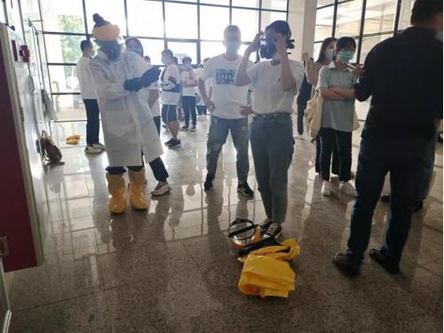 演练采用现场演练和实际操作演练相结合的模式,既保证了演练的质量,也实现了全院参与。现场演练分为两个部分,首先是视频和演示观摩学习,视频详细地向在场师生展示了实验室危化品泄露情况下的应急逻辑以及具体的应急措施,强调了遇事勿慌,从而实现反常情况下的正常发挥,才能更好地应对各种紧急情况。随后是实际操作演练,在场师生进行分组后,在领队老师的带领下,对护目镜、防护服和防护面罩等的穿戴进行了逐一尝试,并对移动喷淋装置进行了实操,使用中各领队老师也对洗眼器的冲洗时间等细节进行了强调,这些操作细节与处理逻辑往往是紧急情况发生时危险处置是否达到紧急预案最终目标的重要关键点。